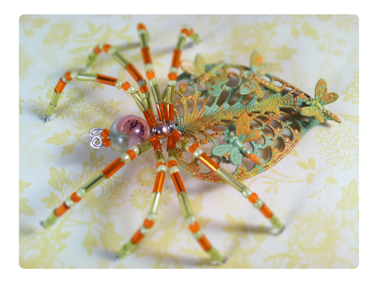 I bought what I thought was a copper leaf finding at a bead shop and took it home to torch it and watch the colors change (and use it for a copper spider), but when I discovered it wasn't copper, I decided to take a different approach. The green/orange/gold color scheme was very vivid in my mind's eye, and it even turned out the way I envisioned it, with small brass dragonflies glued all over. I kept thinking of the way dragonflies skim across ponds in the summer light, and I wanted a spider that would reflect the light and shadow of these colors on a pond.