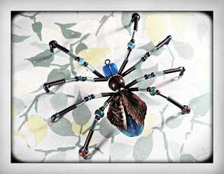 When I took the kids to the Samuel Lewis State Park on Saturday, Greta had a lot of fun walking around the park and looking at the small signs identifying each tree. Beneath the beech tree were many, many seed pods that looked like small man-eating plants. I visualized the seed pod like a bead cap over a glass focal bead or a faceted, gem-like focal bead, which is ultimately how I ended up making this spider, but it doesn't exactly look thematic. I wanted shiny blue glass with matte, natural browns, and that's how this spider turned out.